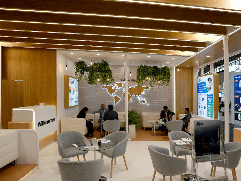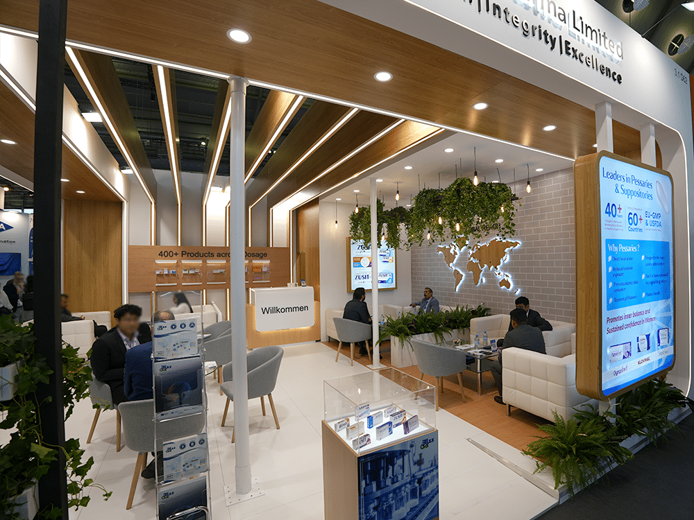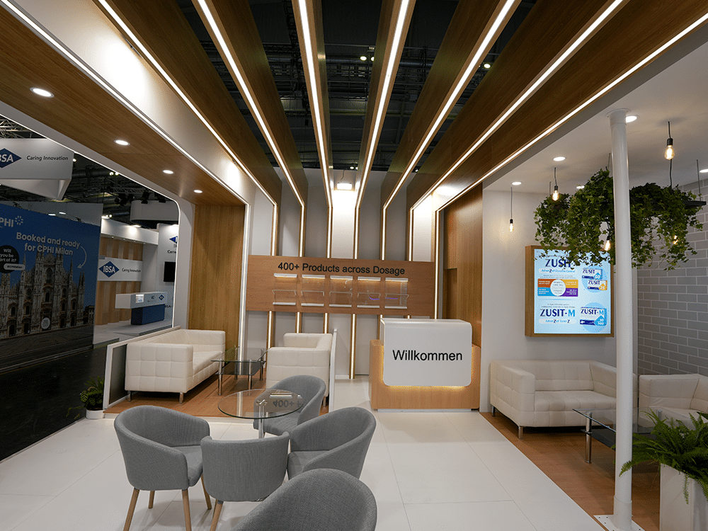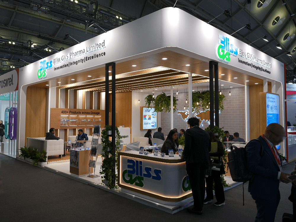 The Bliss GVS Pharma Limited booth at the CPHI exhibition presents a modern and elegant design, dominated by white, wood, and green accents. The open layout encourages business conversations and invites visitors inside. The interior is decorated with numerous plants and hanging lamps, creating a friendly and eco-friendly atmosphere.