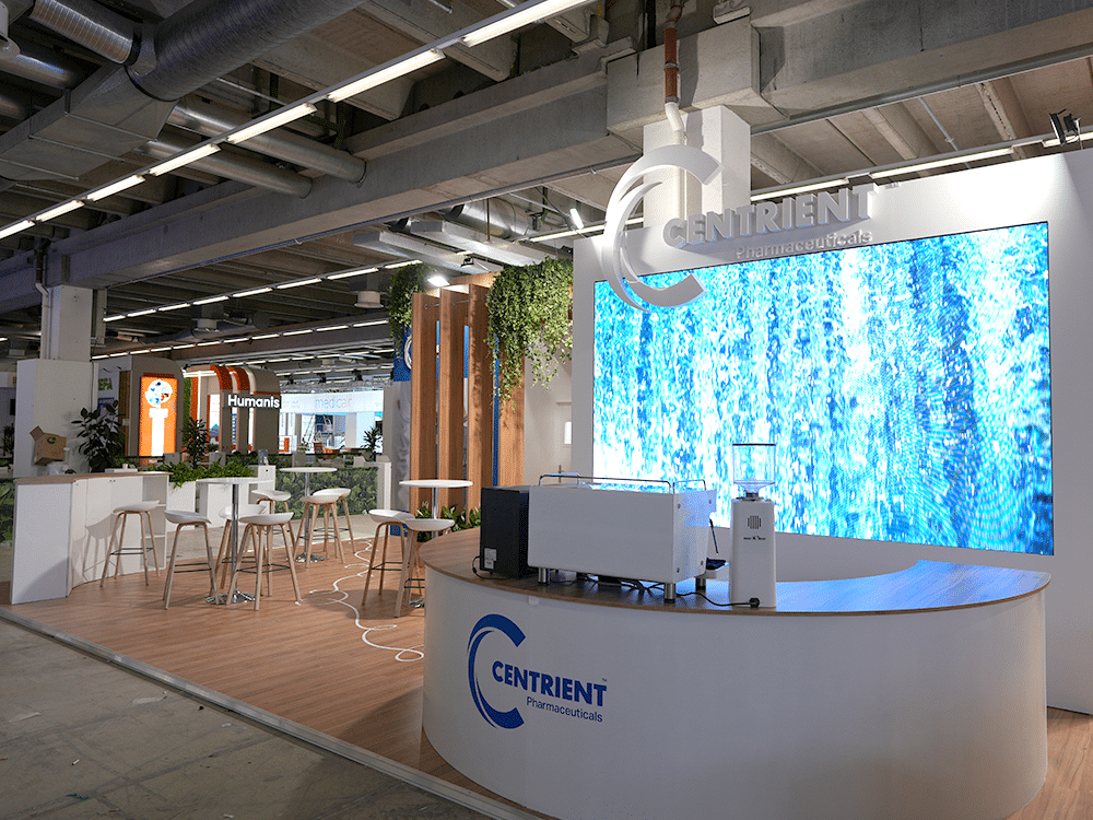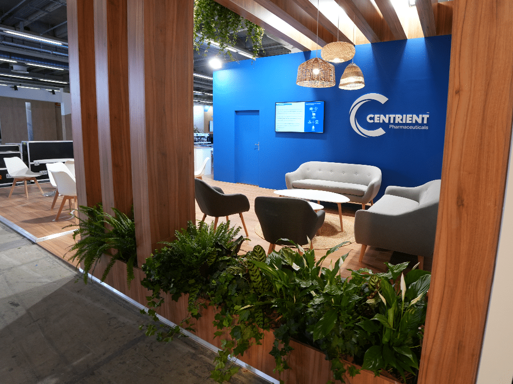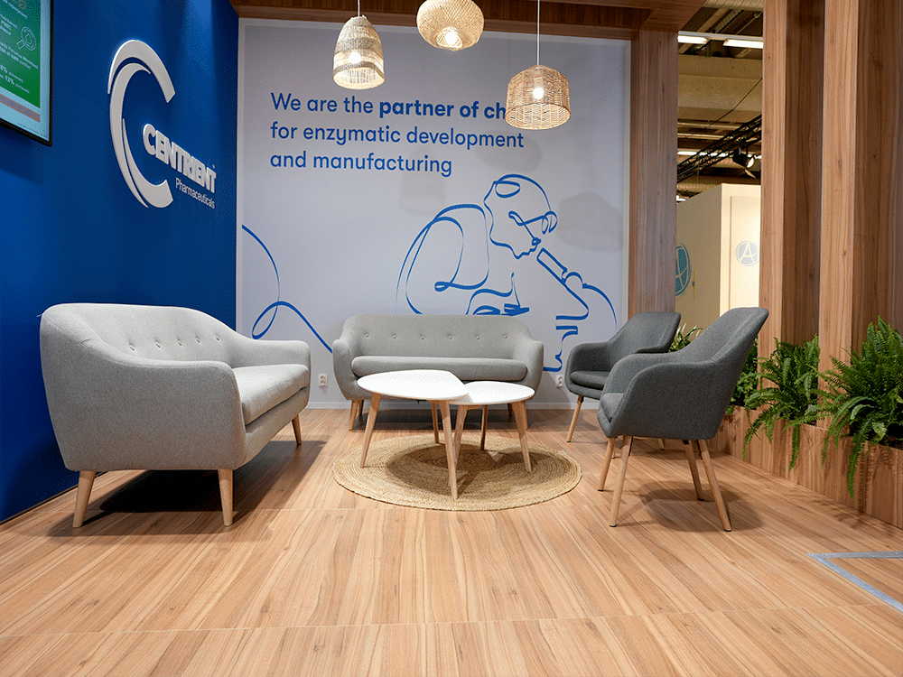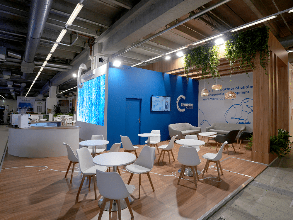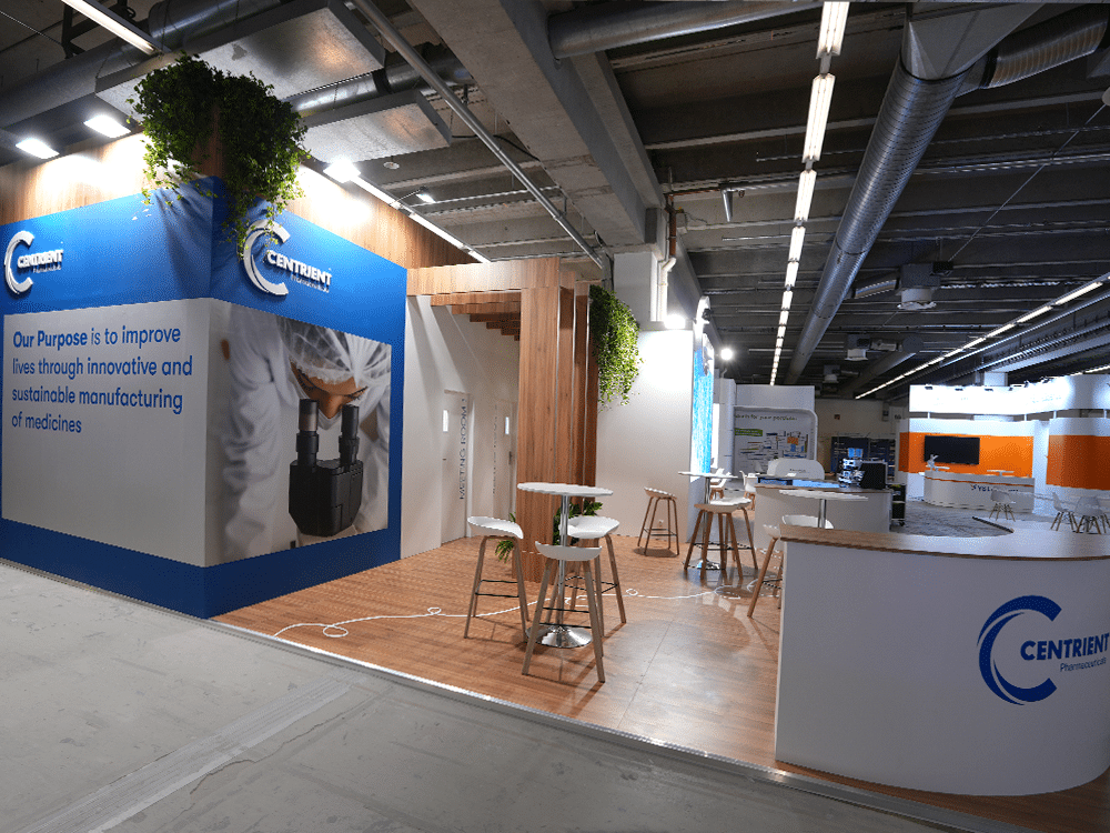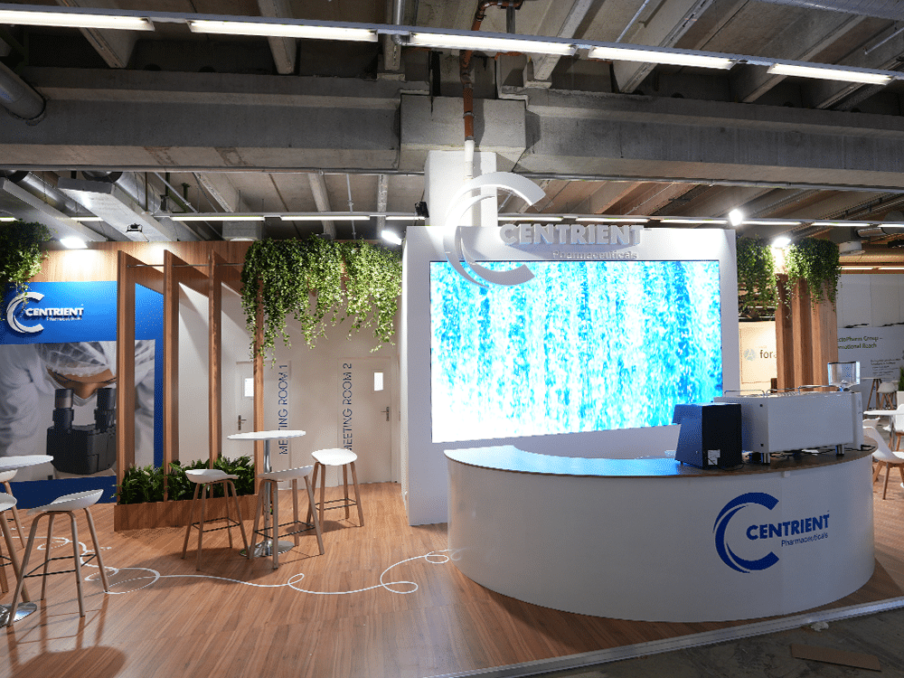 The Centrient Pharmaceuticals booth at the CPHI exhibition stands out with its modern, minimalist design and elegant finish. The space is dominated by light colors – white, wood, and blue accents – emphasizing the brand’s professional image.