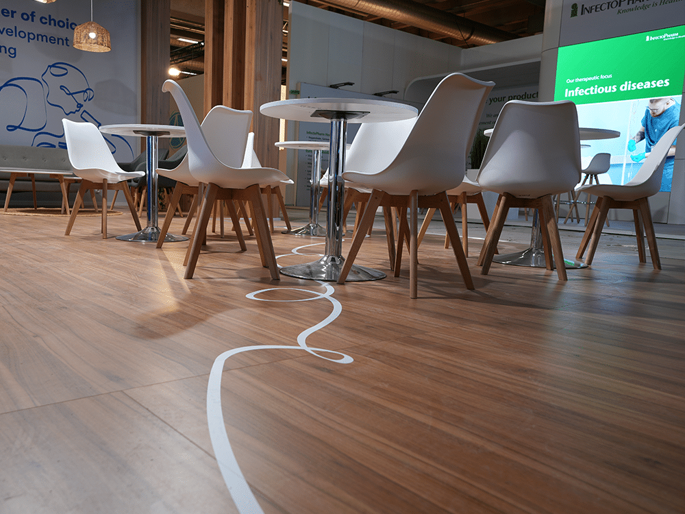 The central feature is a large illuminated LED screen with dynamic visuals that capture visitors’ attention. The layout includes a reception area, an open discussion zone with high tables, and two private meeting rooms. Green plants hanging from the ceiling and placed in planters add a natural and refreshing touch to the overall design. The booth appears highly aesthetic, clear, and functional, reflecting the company’s modern approach to innovation in the pharmaceutical industry.