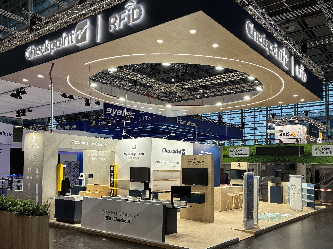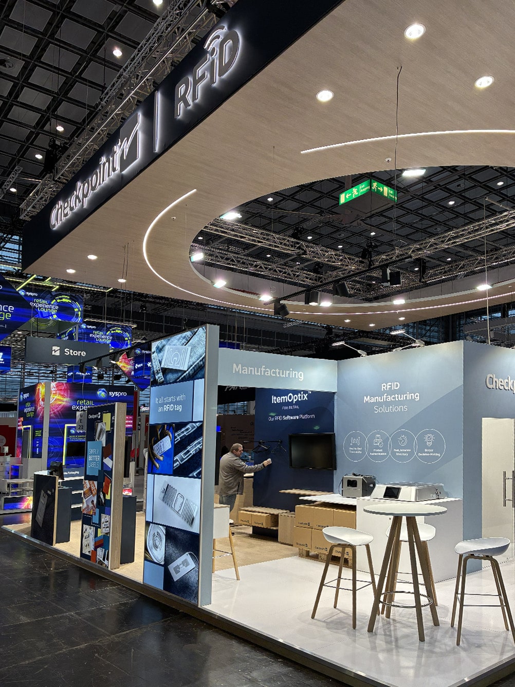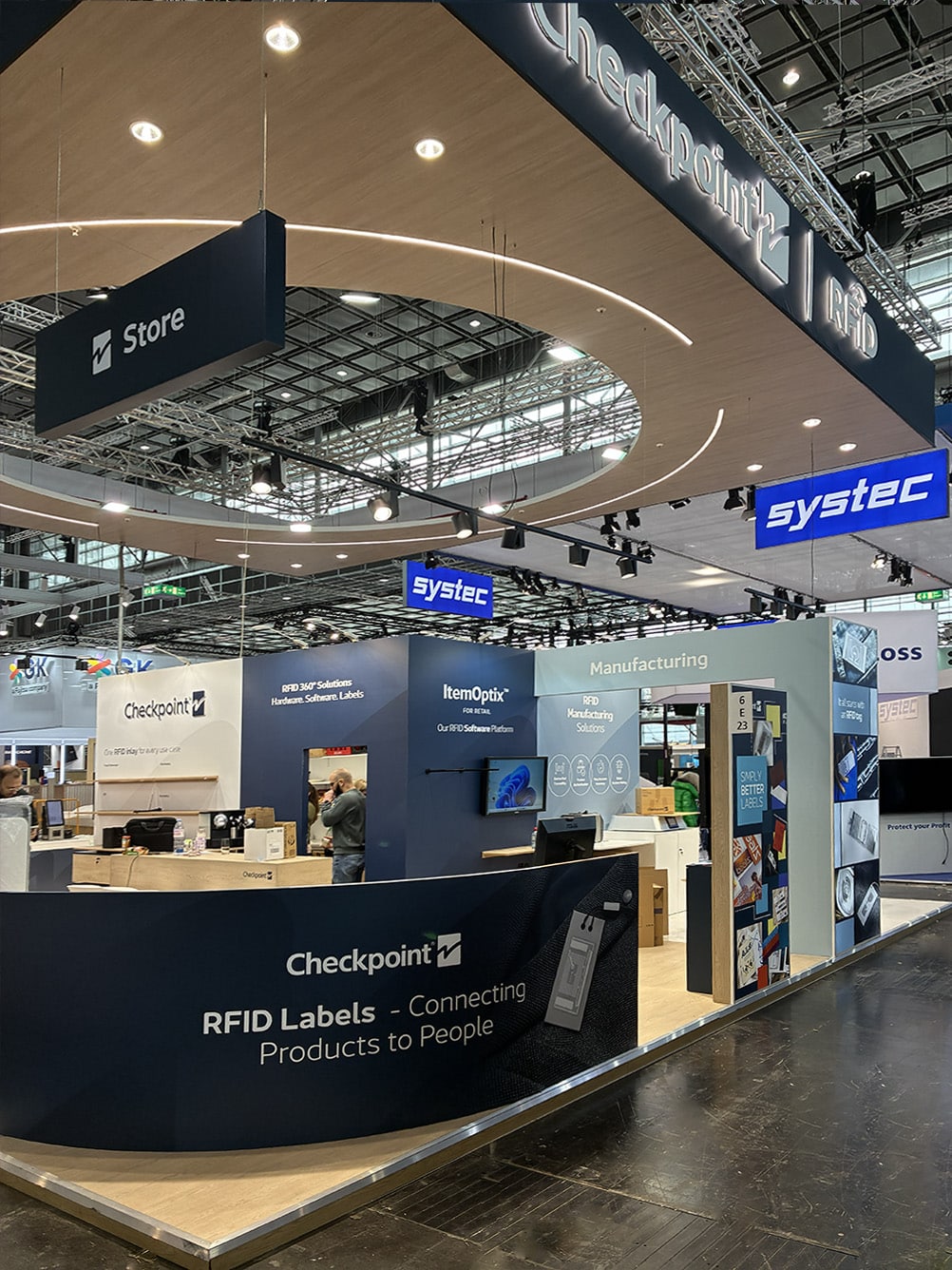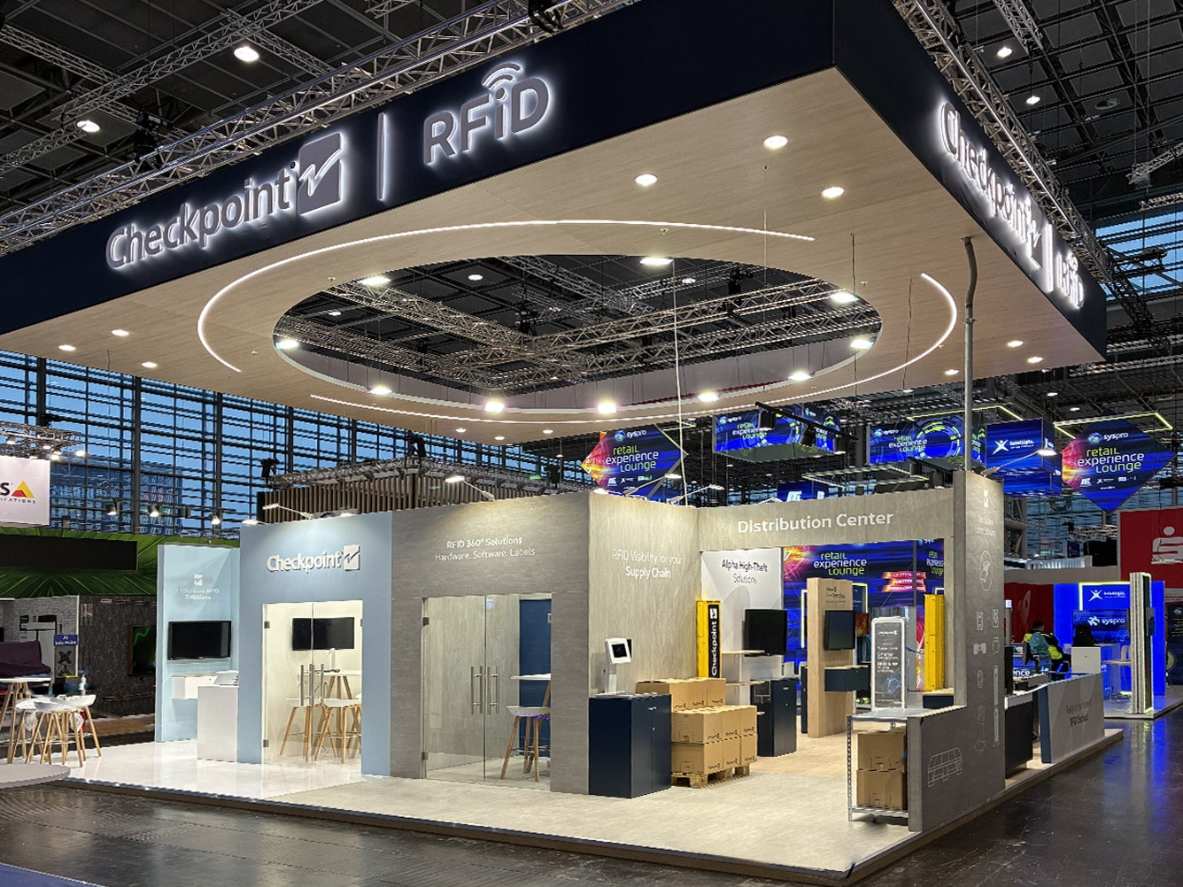 The 110 sqm island exhibition stand presented at EuroShop 2026 is a modern, fully open display space designed to maximize brand visibility and ensure smooth visitor flow. A key architectural feature is the striking suspended structure with an illuminated Checkpoint RFID logo, enhancing brand recognition and attracting attention from a distance. The design combines elegant wood-inspired finishes with minimalist architecture, emphasizing the innovative nature of RFID solutions.