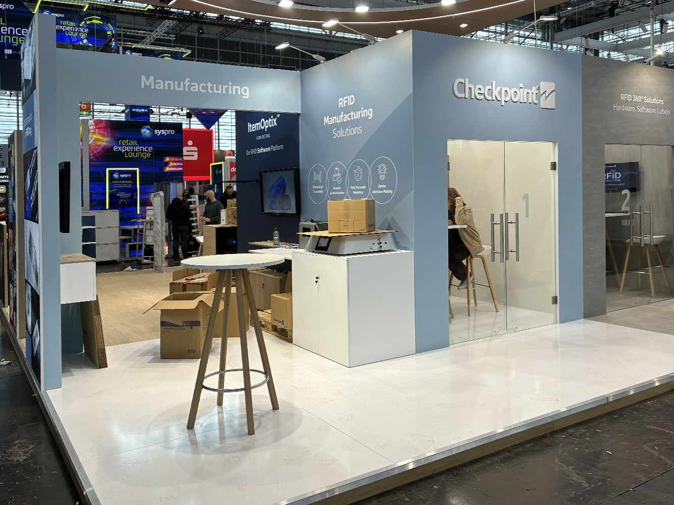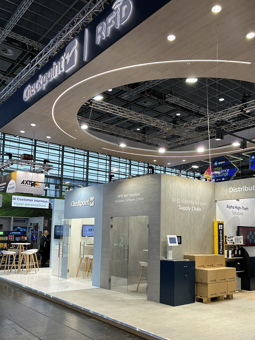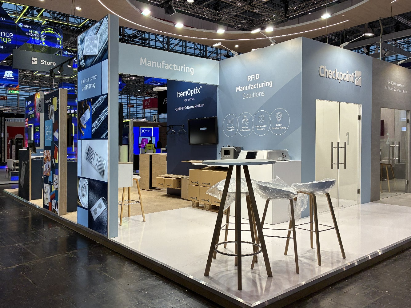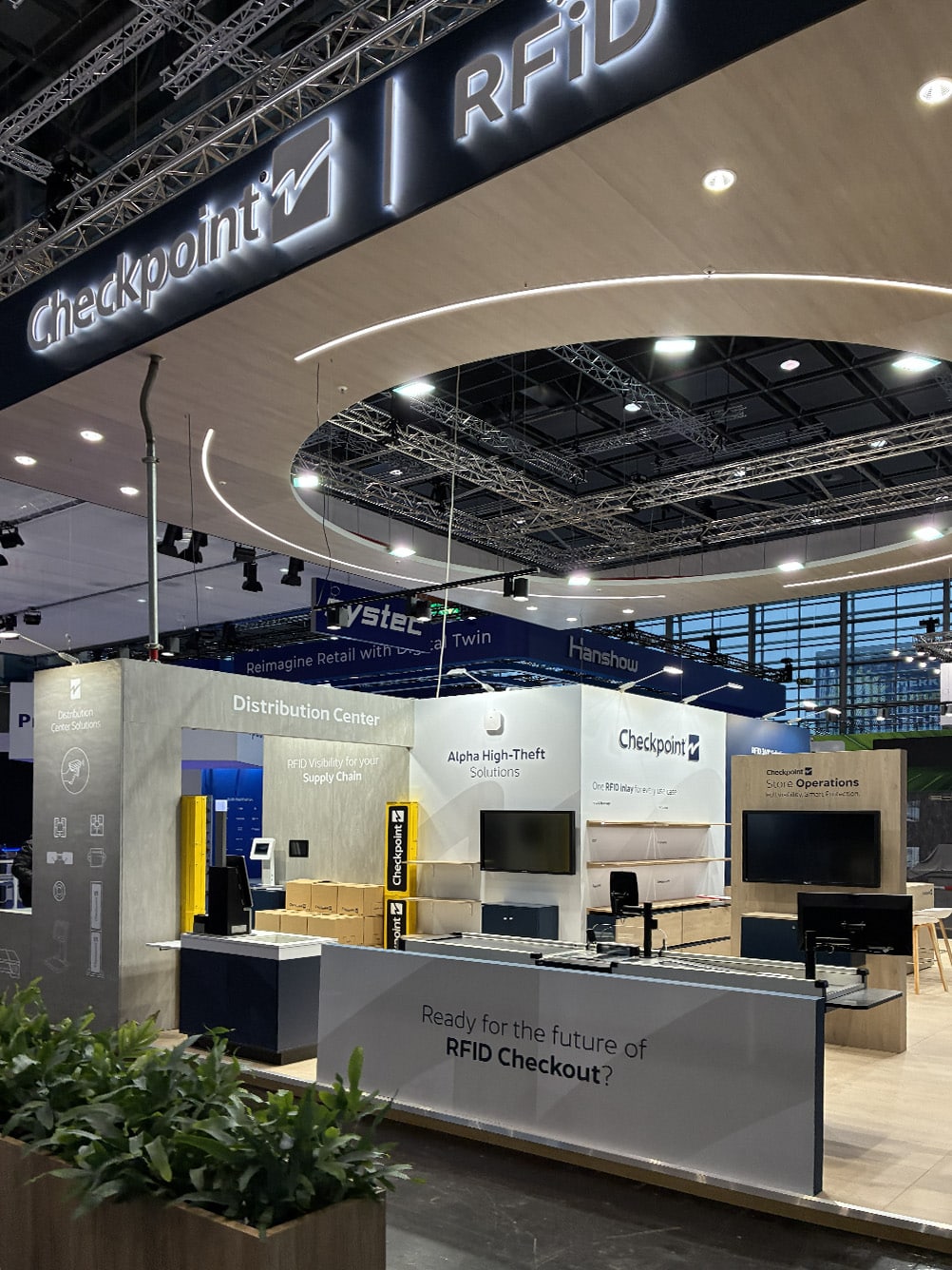 The 110 sqm island exhibition stand presented at EuroShop 2026 is a modern, fully open display space designed to maximize brand visibility and ensure smooth visitor flow. A key architectural feature is the striking suspended structure with an illuminated Checkpoint RFID logo, enhancing brand recognition and attracting attention from a distance. The design combines elegant wood-inspired finishes with minimalist architecture, emphasizing the innovative nature of RFID solutions.