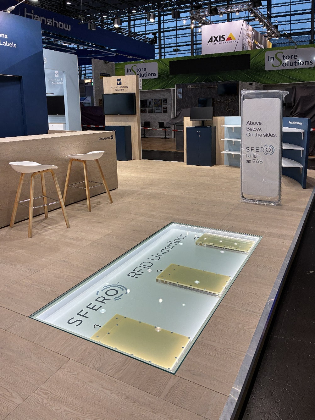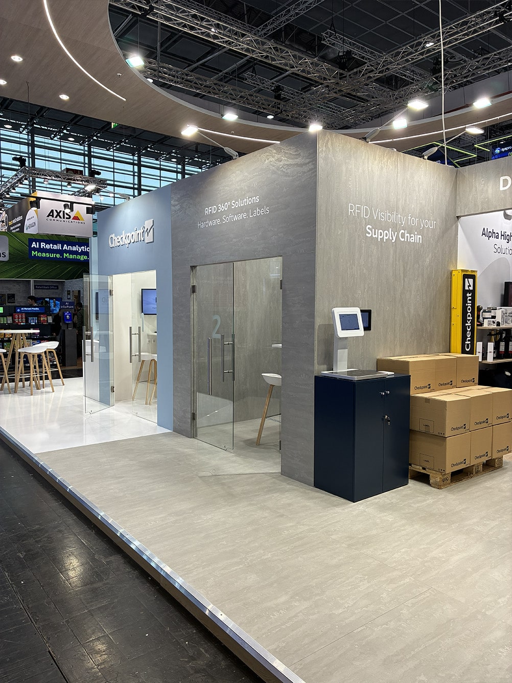 At the heart of the stand is a demonstration area featuring an RFID system integrated into the floor, enabling live technology presentations in a realistic retail environment. The space is divided into functional thematic zones covering loss prevention solutions, intelligent checkout systems, and real-time inventory management. The open island layout provides access from all sides, increasing visitor traffic, enhancing B2B meeting comfort, and improving overall sales effectiveness.