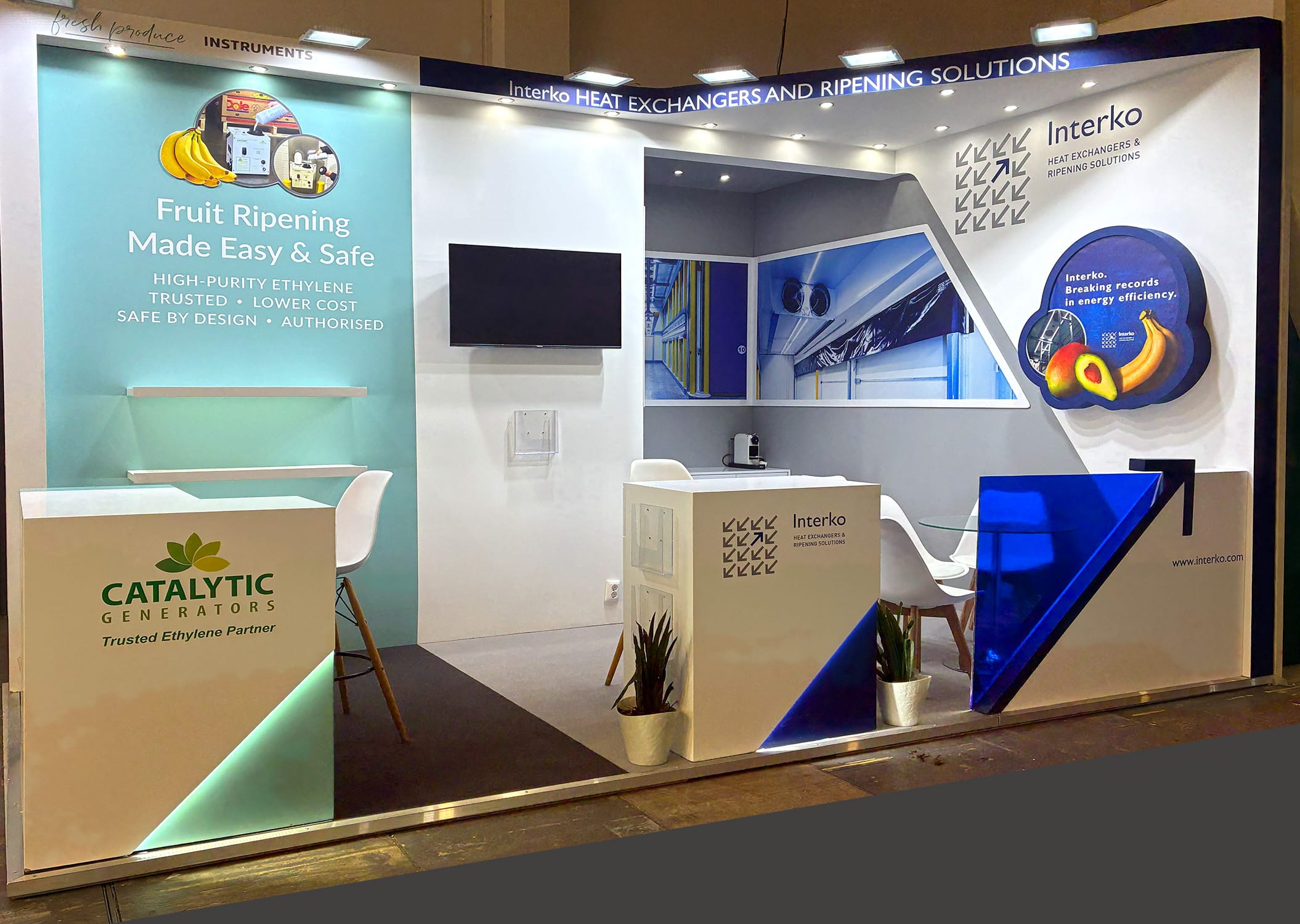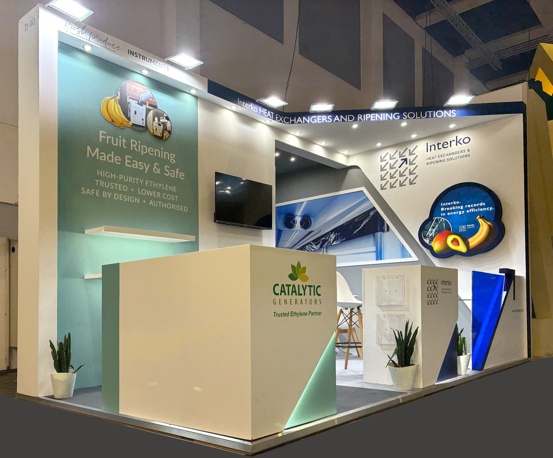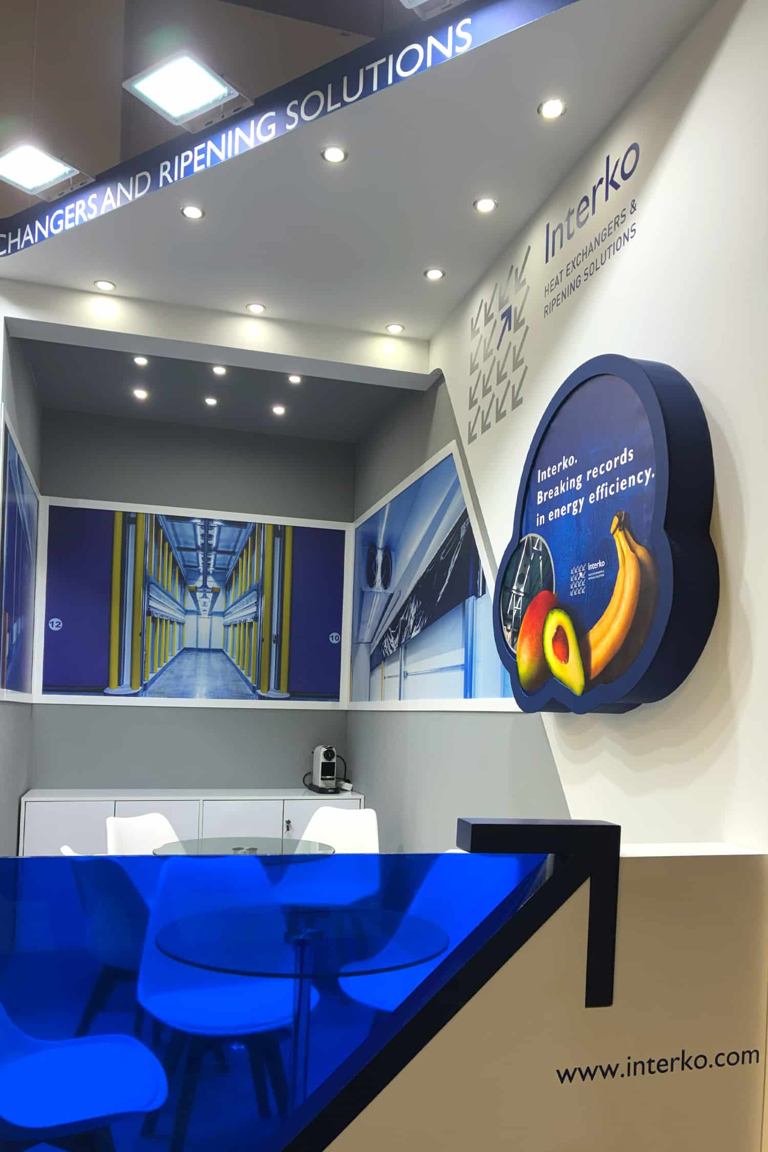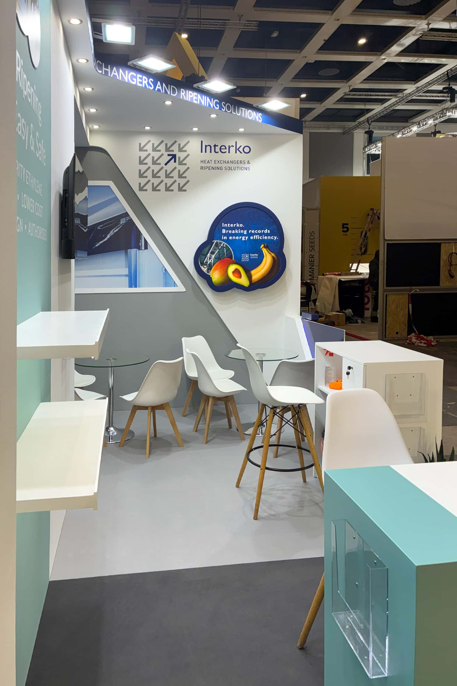 Additional lighting elements and a screen enhance the brand’s modern image. The overall result is a functional and visually appealing stand, perfectly suited for international trade fairs such as Fruit Logistica.