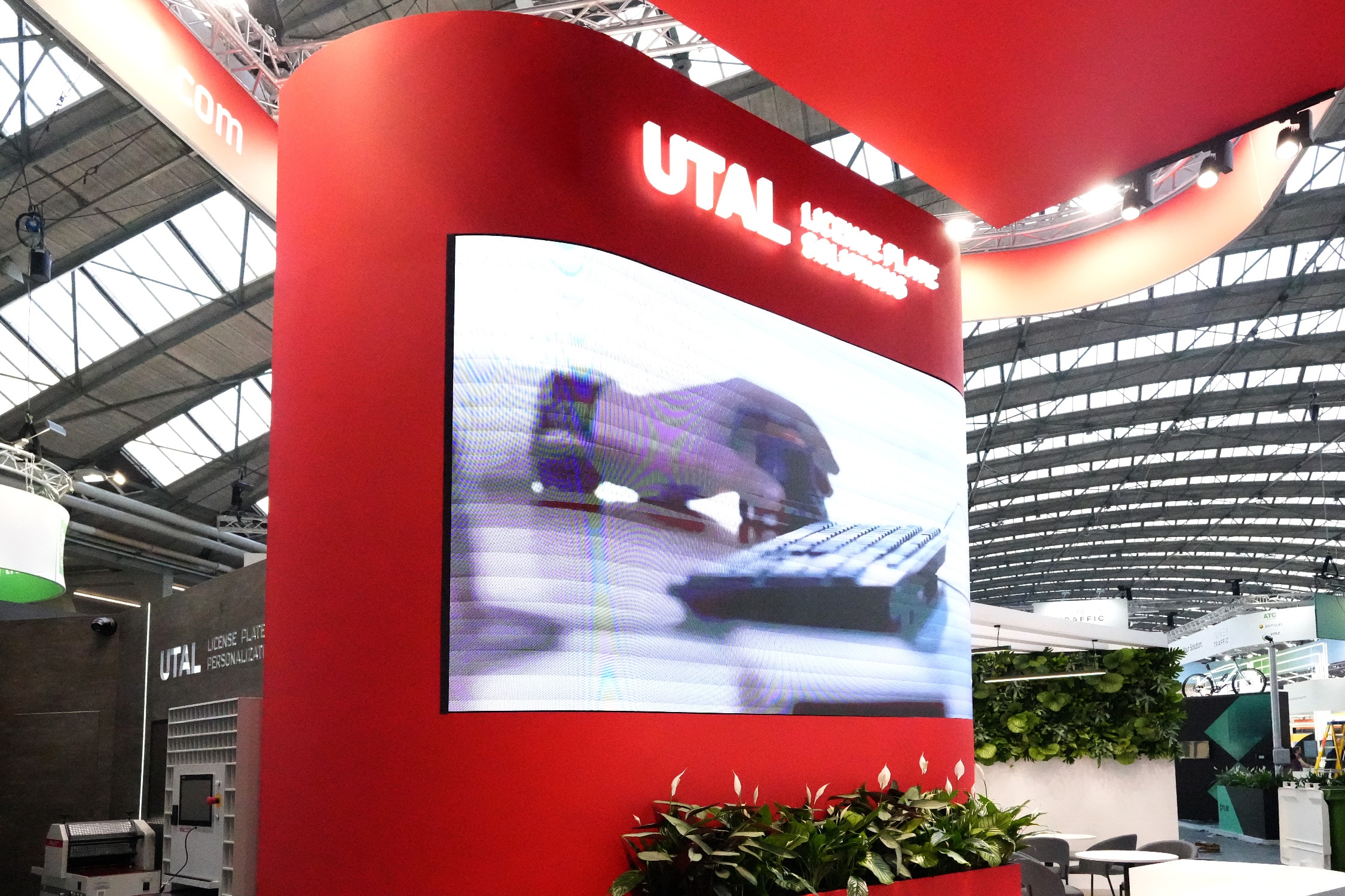 The exhibition stand for UTAL License Plate Solutions, presented at Intertraffic Amsterdam, was designed on a 100 m² area and featured a modern, open architectural concept. The central element of the space was a tall red structure with a large presentation screen that attracted visitors’ attention from across the exhibition hall. Above the stand, a distinctive suspended frame with the company’s logo ensured strong brand visibility from multiple directions.