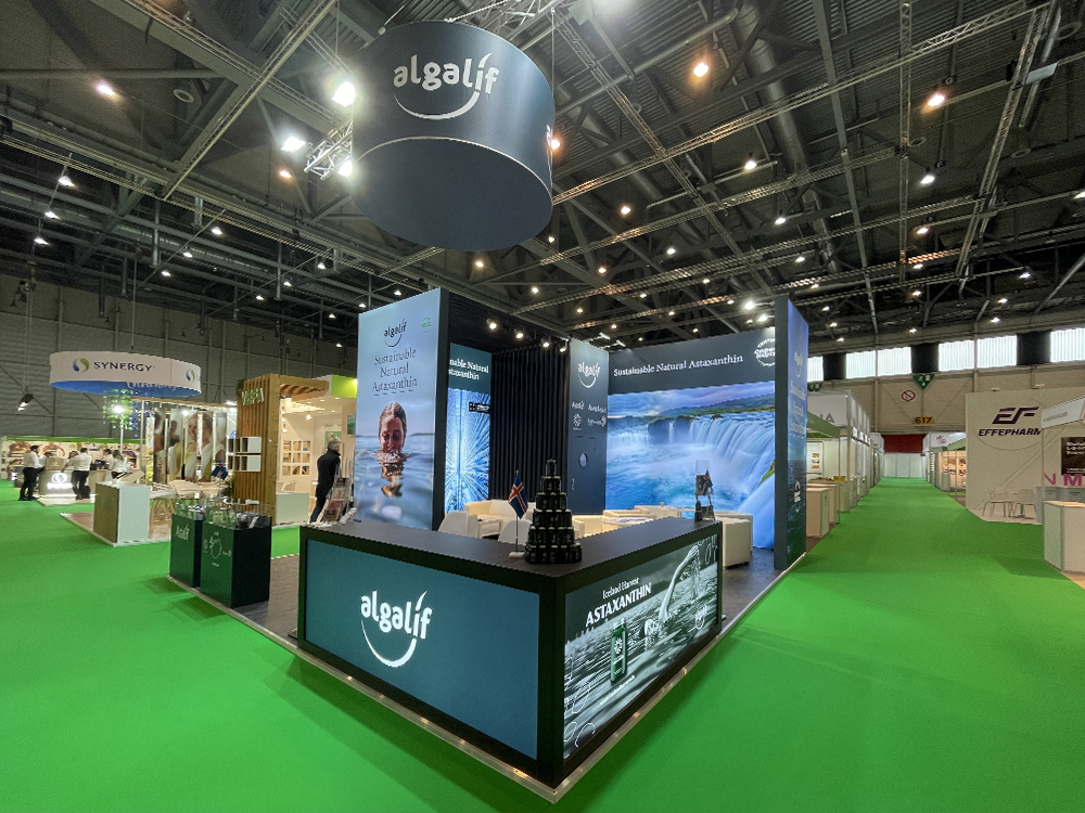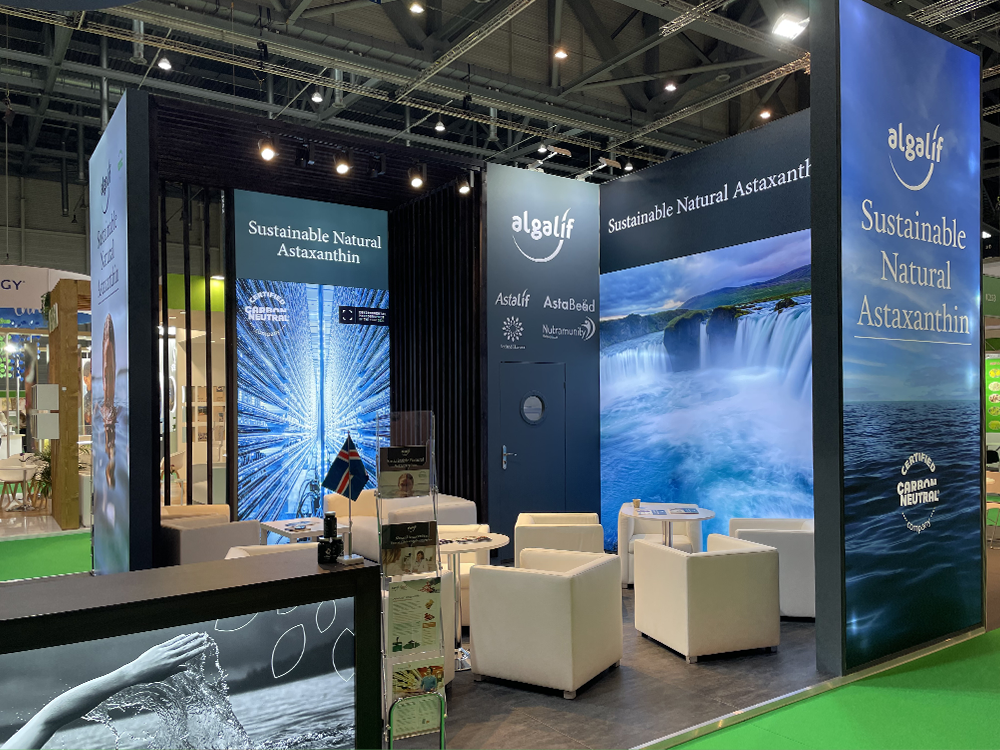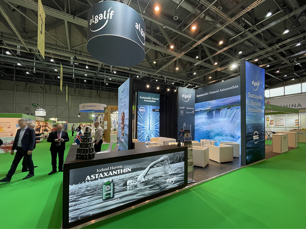 Grafiki na stoisku przedstawiają malownicze islandzkie krajobrazy lub zakład produkcyjny z siecią rur. Podłoga została dobrana w kolorystyce przywodzącej na myśl wybrzeża Islandii oraz zastygłą magmę po wybuchach wulkanów. Ażurowe ściany wydzielające strefę rozmów oraz elementy lady wykonano z ciemnego drewna, inspirowanego lokalną architekturą wyspy. Logo firmy jest widoczne, lecz nie dominuje nad nazwą i marką prezentowanych produktów, zachowując elegancką równowagę całego projektu.