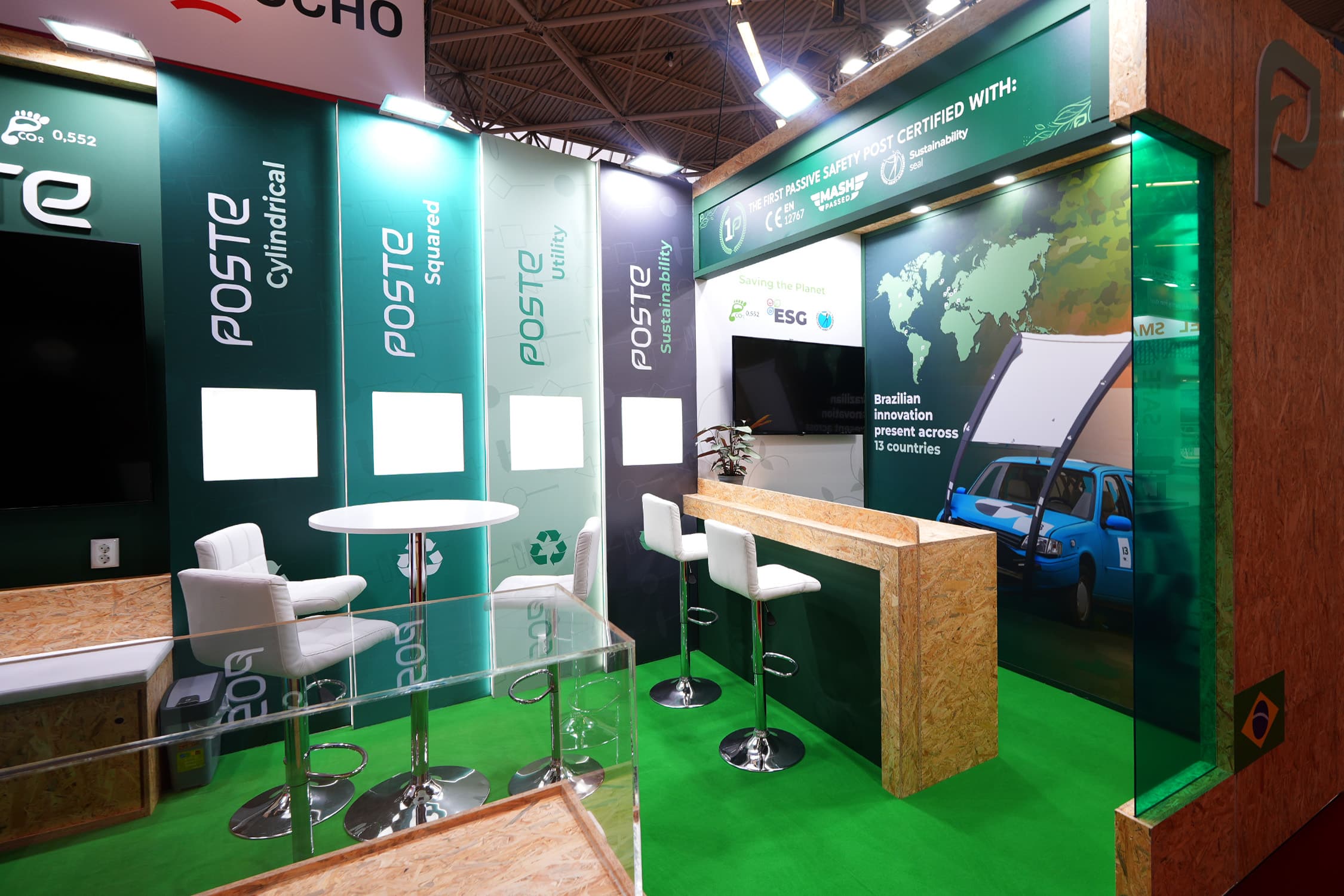 Centralnym elementem stoiska była duża ściana z wyeksponowanym logotypem Ecoposte oraz ekranem multimedialnym przeznaczonym do prezentacji materiałów wideo i informacji o rozwiązaniach firmy. Na bocznych panelach zaprezentowano warianty systemów słupków drogowych wraz z grafikami i opisami, które w przejrzysty sposób komunikowały ich funkcje oraz certyfikaty bezpieczeństwa. W centralnej części znalazła się niewielka strefa spotkań z wysokim stolikiem i krzesłami barowymi, umożliwiająca prowadzenie rozmów z odwiedzającymi. Na narożniku stoiska umieszczono ladę recepcyjną z brandingiem firmy, która stanowiła pierwszy punkt kontaktu z gośćmi.