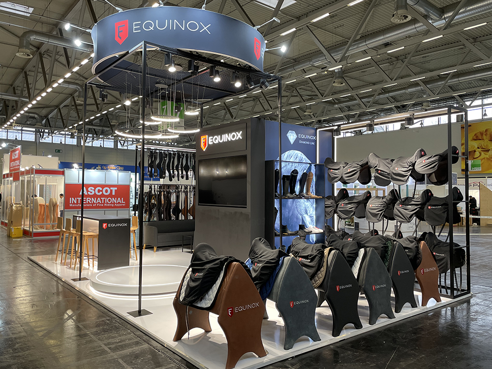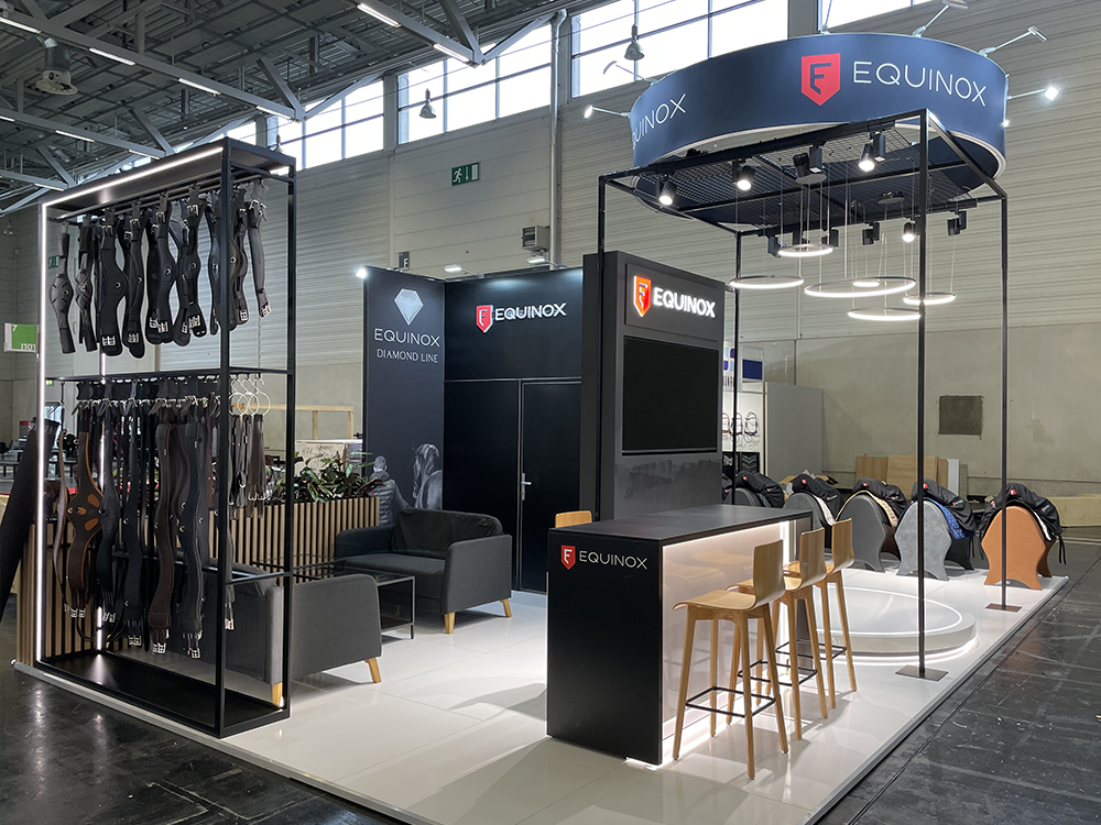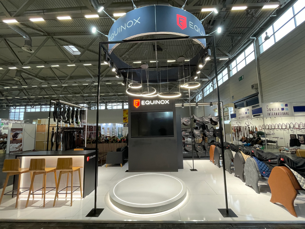 Przestronne, wyspowe stoisko systemowe do prezentacji ekskluzywnych polskich siodeł skórzanych. Otwarta konstrukcja zapewnia doskonałą widoczność produktów, z podświetlanym okrągłym podestem na nowości i przymiarki. Wysokie, stalowe podświetlane regały pełnią funkcję przegrody i ekspozycji, a dzięki modułowej konstrukcji łatwo je wykorzystać na innych targach.