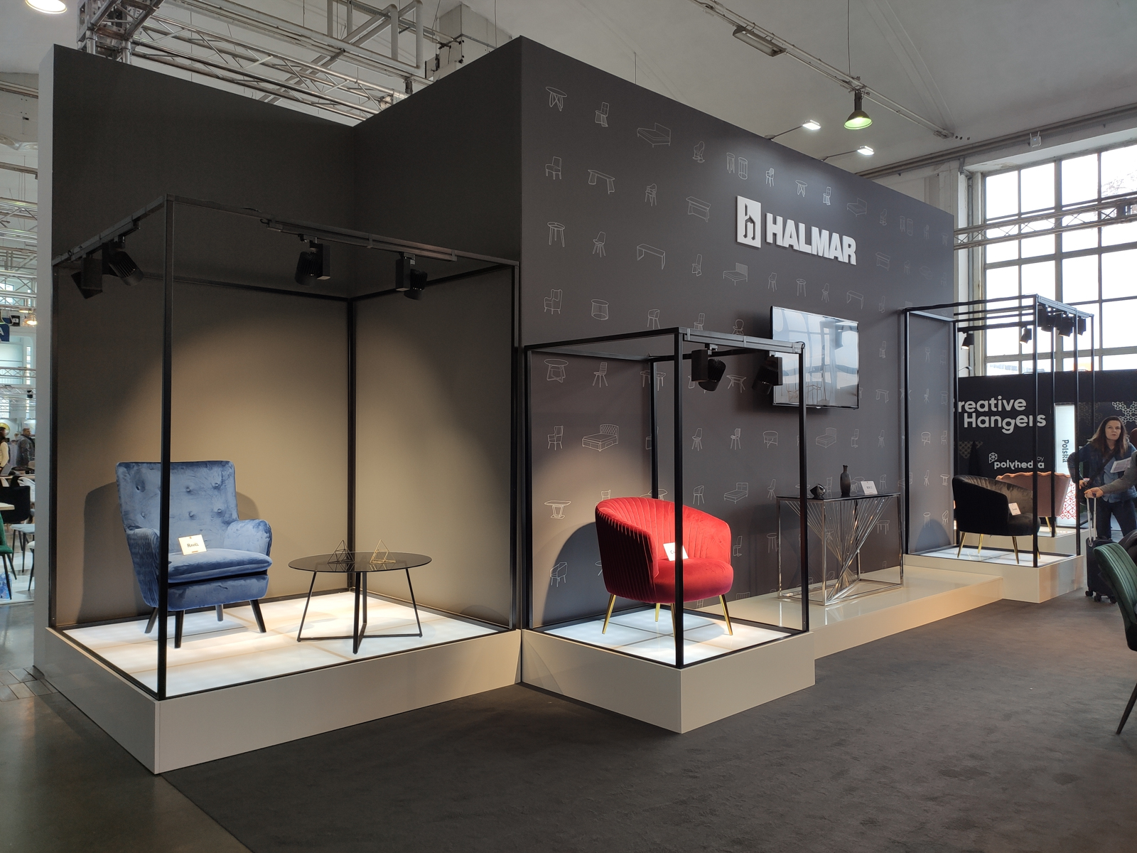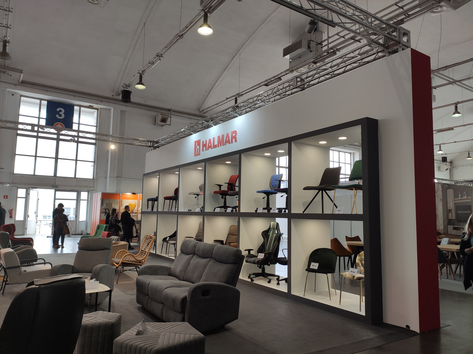 Jest to nasz wieloletni klient, który na przestrzeni lat ewoluował w zakresie prezentacji mebli. Zaczynał od prostego stoiska w biało-czerwonych kolorach z dużą ilością kratownicy, następnie stopniowo wprowadzał delikatne akcenty szarości, aż po nowoczesne, dynamiczne i odważne kolory oraz stoiska systemowe.