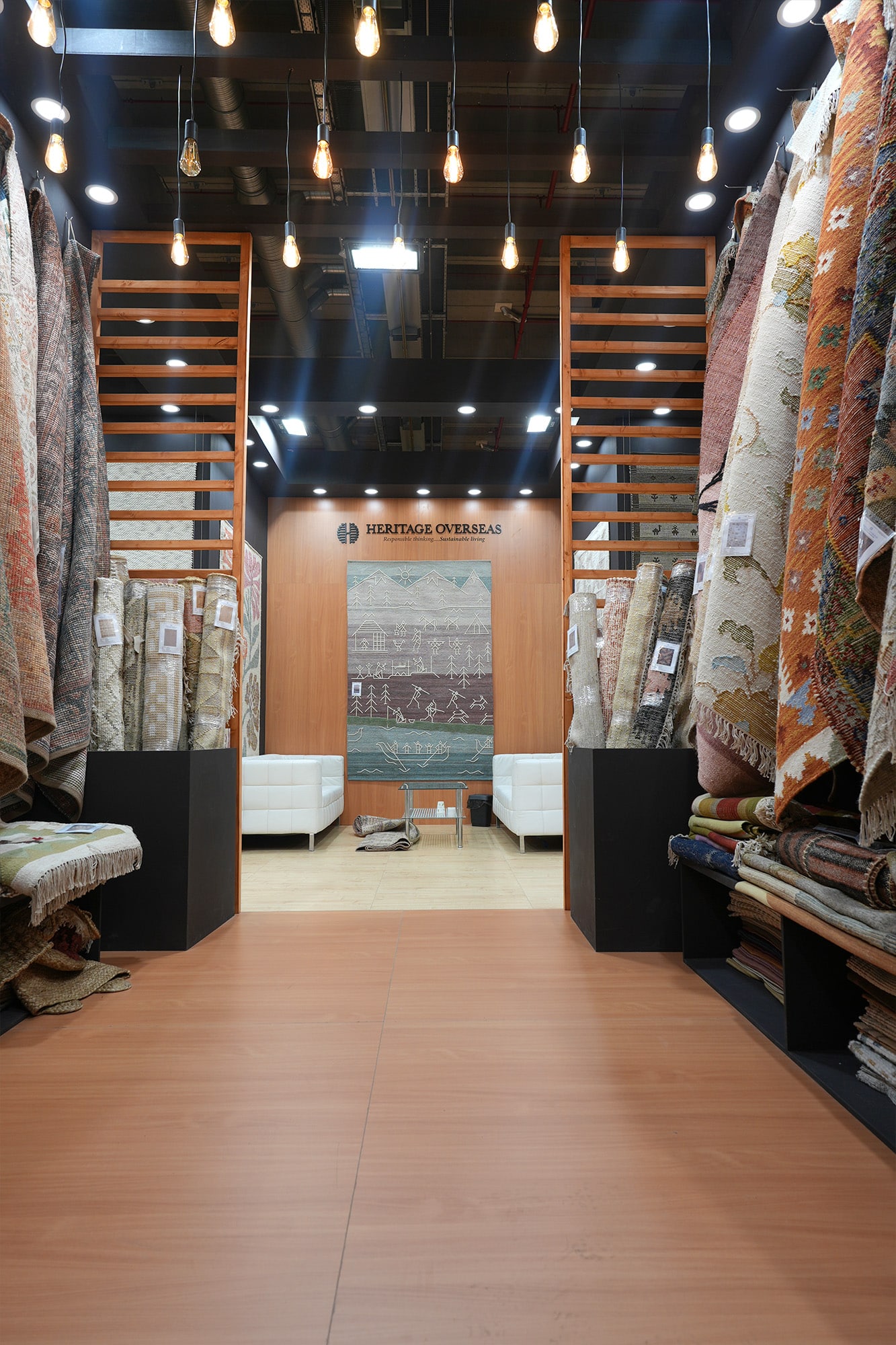 Front stoiska jest otwarty i zapraszający – szerokie wejście prowadzi do wnętrza, w którym wyraźnie wydzielono kilka stref ekspozycyjnych. Po bokach znajdują się wysokie moduły ścienne z półkami, przeznaczone na prezentację próbek i akcesoriów. Na ścianach oraz wolnostojących konstrukcjach eksponowane są dywany – zarówno wiszące pionowo, jak i ułożone na stojakach, co pozwala oglądać je z różnych perspektyw.