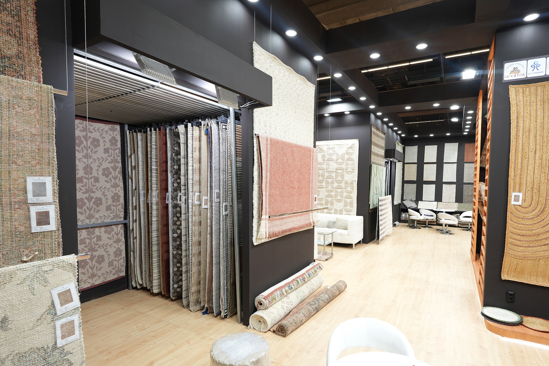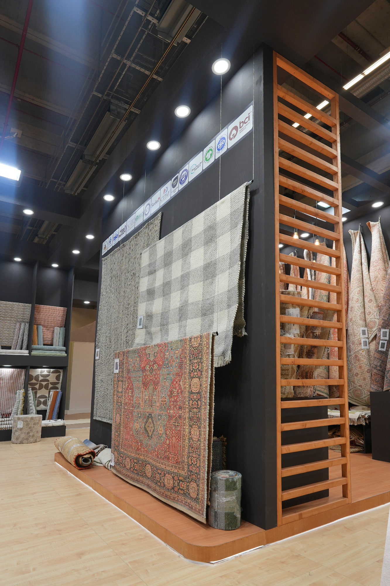 Oświetlenie punktowe w suficie podkreśla fakturę i kolory dywanów, a jasna podłoga rozjaśnia całą przestrzeń. Stoisko sprawia wrażenie eleganckiego, uporządkowanego i funkcjonalnego – zaprojektowanego tak, aby komfortowo prezentować bogatą kolekcję dywanów oraz umożliwiać swobodne poruszanie się po wnętrzu.