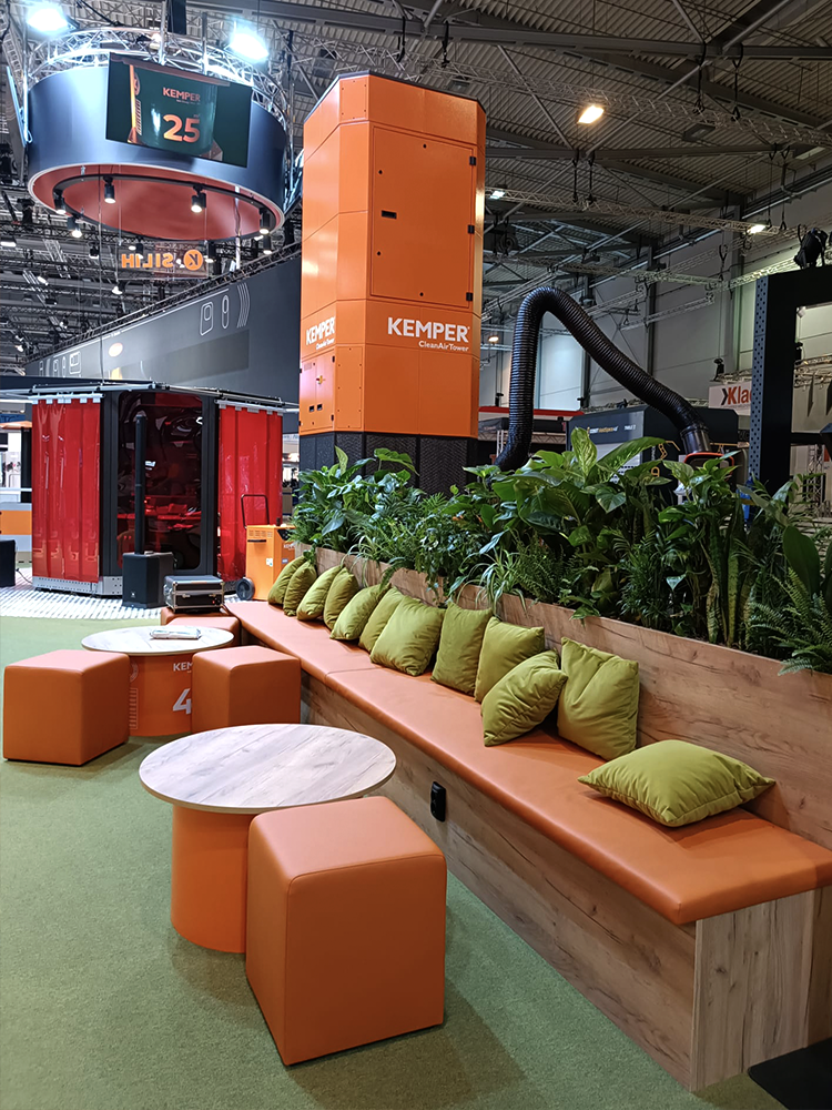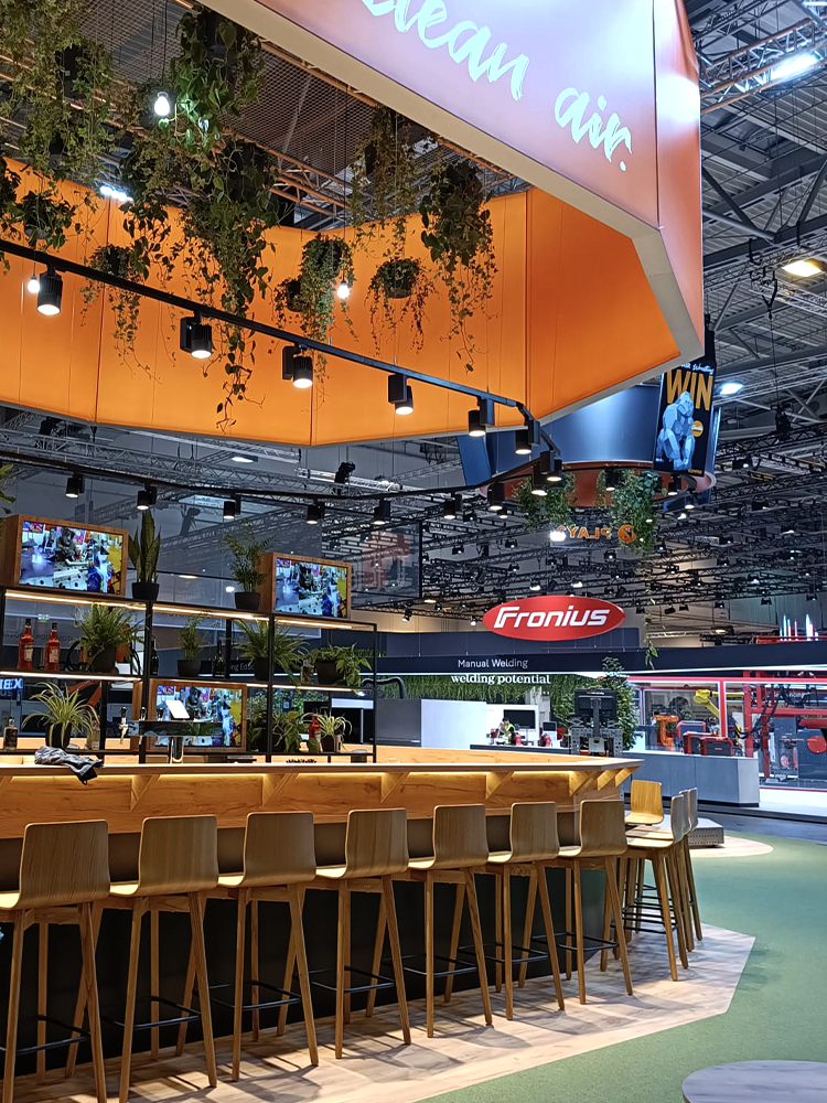 Przestrzeń stoiska została podzielona na kilka funkcjonalnych stref. Głównym miejscem spotkań był bar, wokół którego zlokalizowano strefy do rozmów, prezentację maszyn klienta, podest z samochodem, miejsce do spawania oraz przestrzeń do gier, tworząc dynamiczne i angażujące doświadczenie dla odwiedzających.