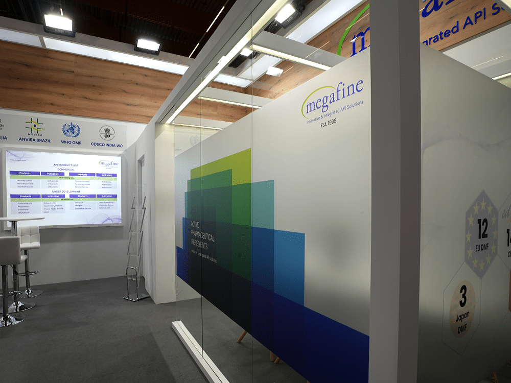 Stoisko firmy Megafine na targach CPhI prezentuje się elegancko i profesjonalnie, z jasną, otwartą przestrzenią utrzymaną w nowoczesnym stylu. Dominują w nim biel, drewno i akcenty w kolorze zielonym oraz niebieskim, co nadaje całości świeży i przyjazny charakter. Na ścianach umieszczono podświetlane panele informacyjne z logotypami instytucji certyfikujących oraz listą produktów API oferowanych przez firmę.