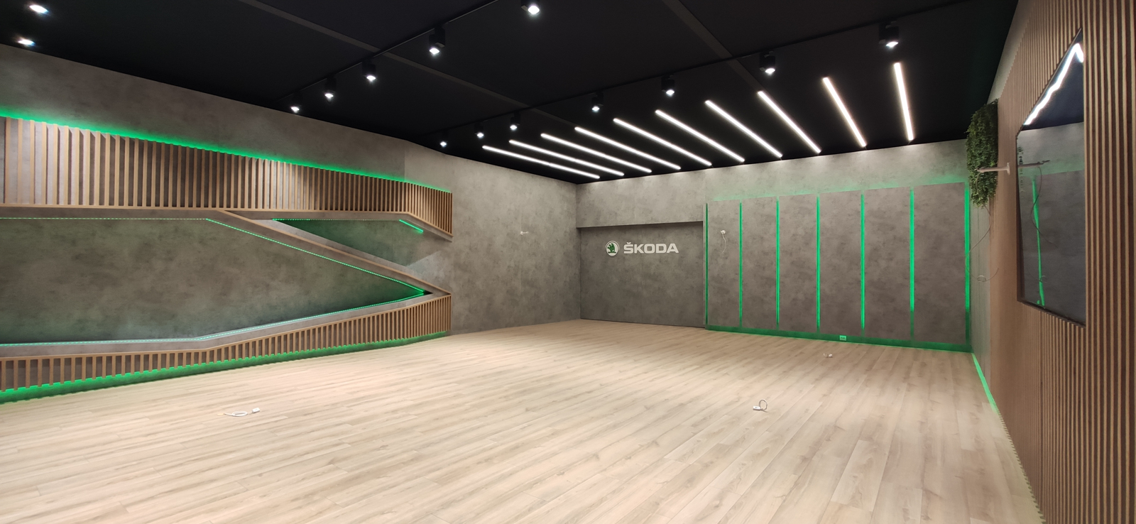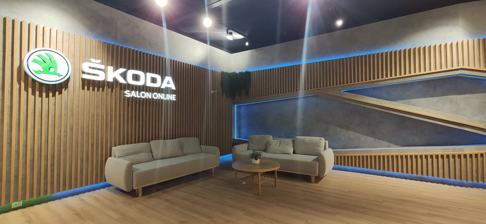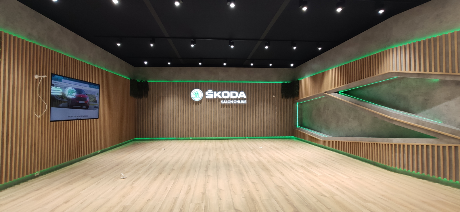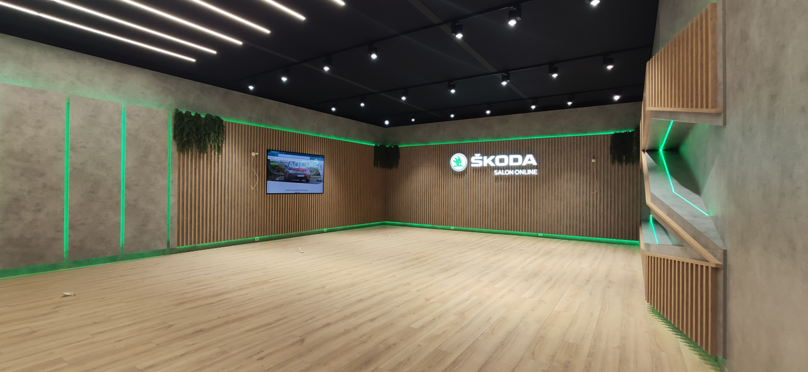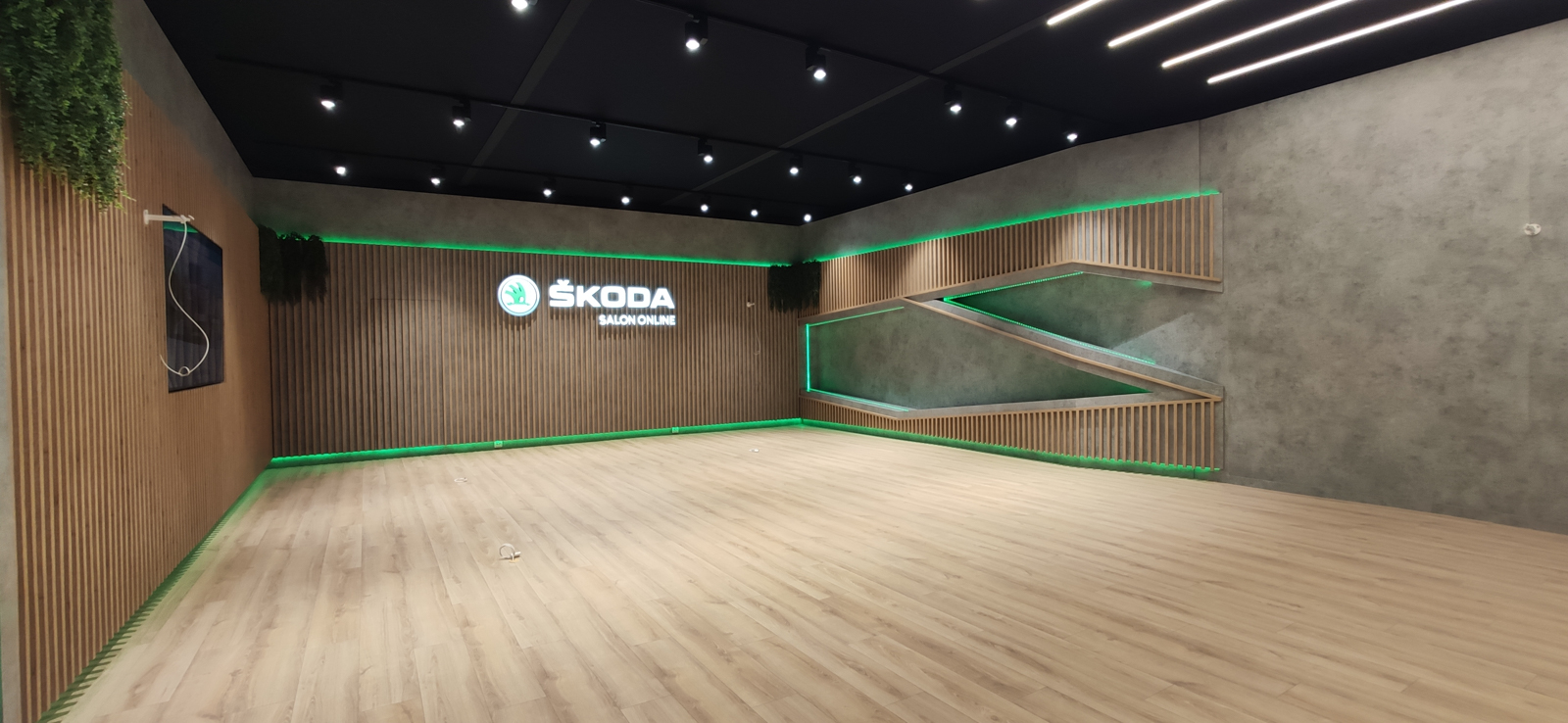 To przestrzeń przeznaczona do prezentacji samochodów online, zaaranżowana w dawnym studiu fotograficznym. Motywem przewodnim projektu są lamele połączone z betonowymi powierzchniami. W lamelowej ścianie ukryto drzwi oraz wbudowany telewizor. Jedna ze ścian została zabudowana konstrukcją inspirowaną dynamiką marki Škoda, z miejscem na ekspozycję rowerów, opon i innych akcesoriów samochodowych.