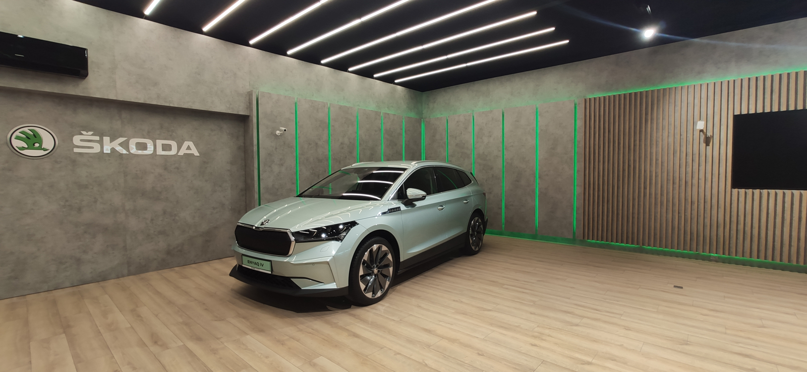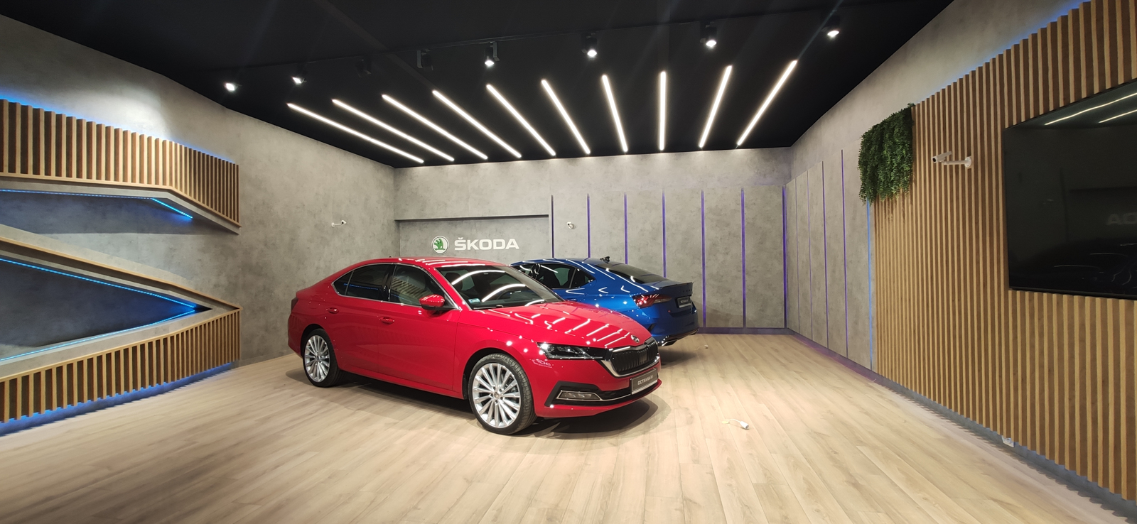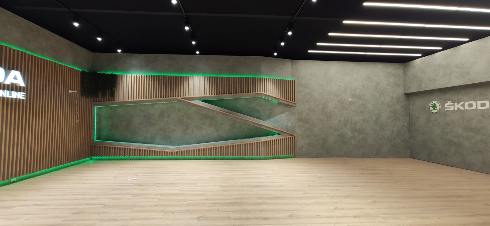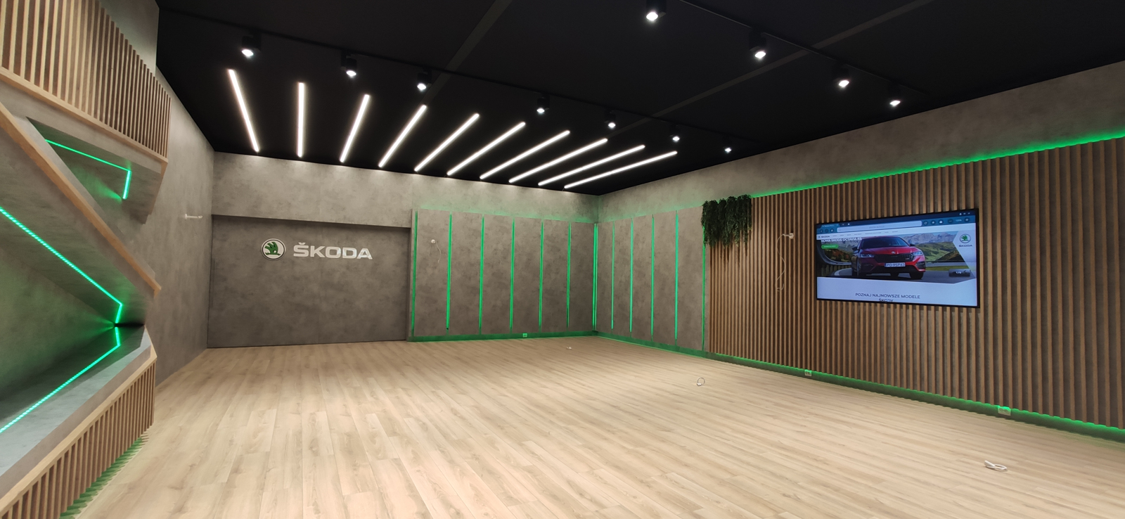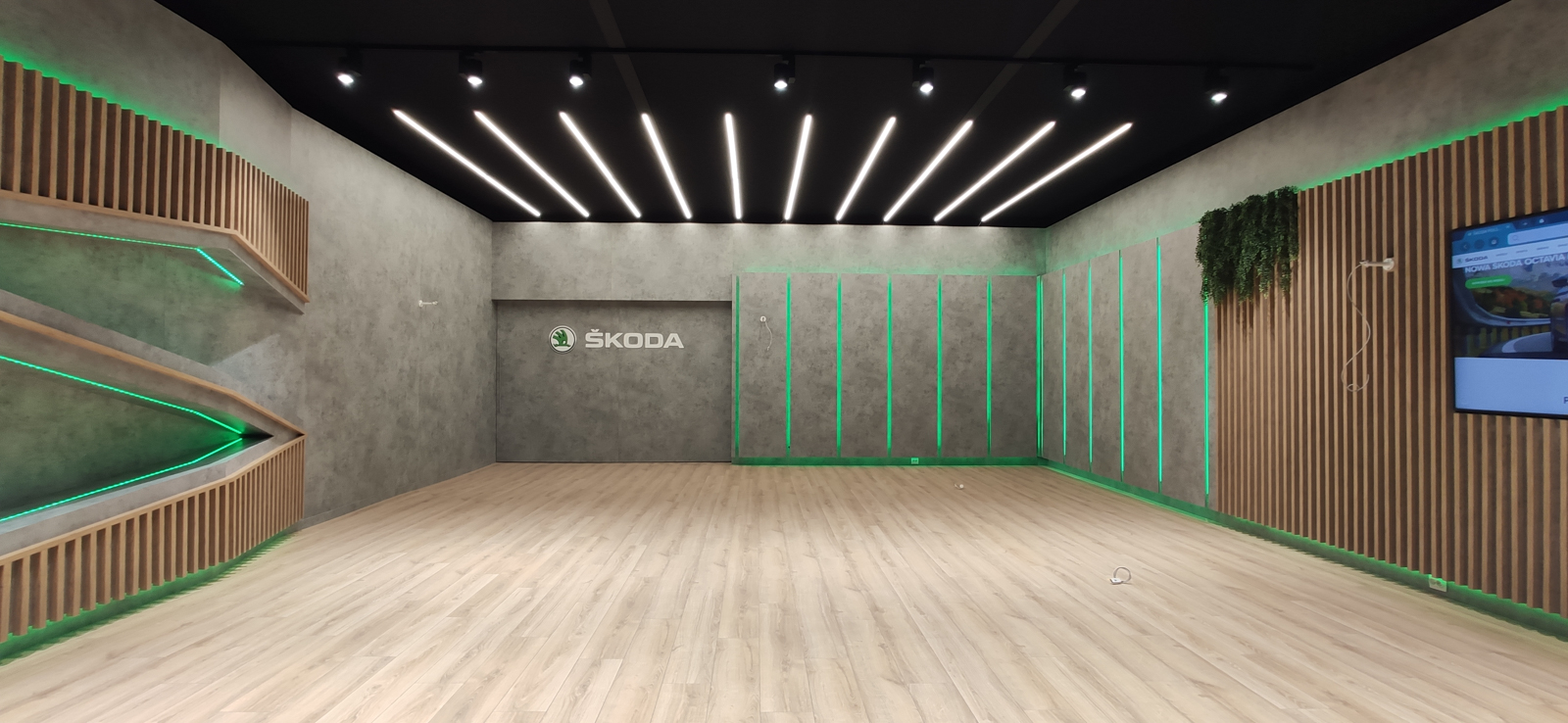 To przestrzeń przeznaczona do prezentacji samochodów online, zaaranżowana w dawnym studiu fotograficznym. Motywem przewodnim projektu są lamele połączone z betonowymi powierzchniami. W lamelowej ścianie ukryto drzwi oraz wbudowany telewizor. Jedna ze ścian została zabudowana konstrukcją inspirowaną dynamiką marki Škoda, z miejscem na ekspozycję rowerów, opon i innych akcesoriów samochodowych.