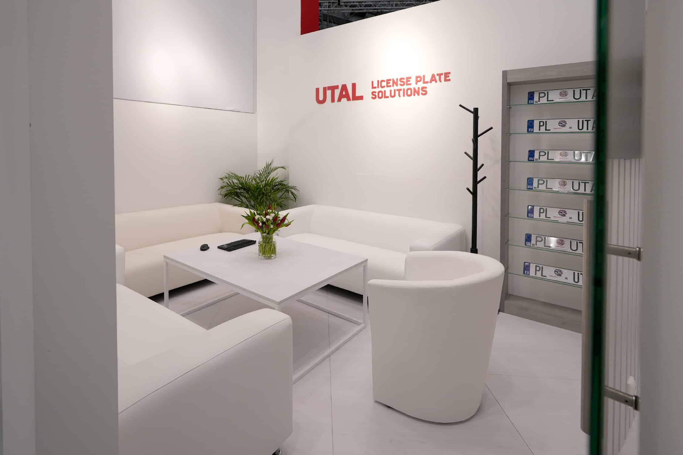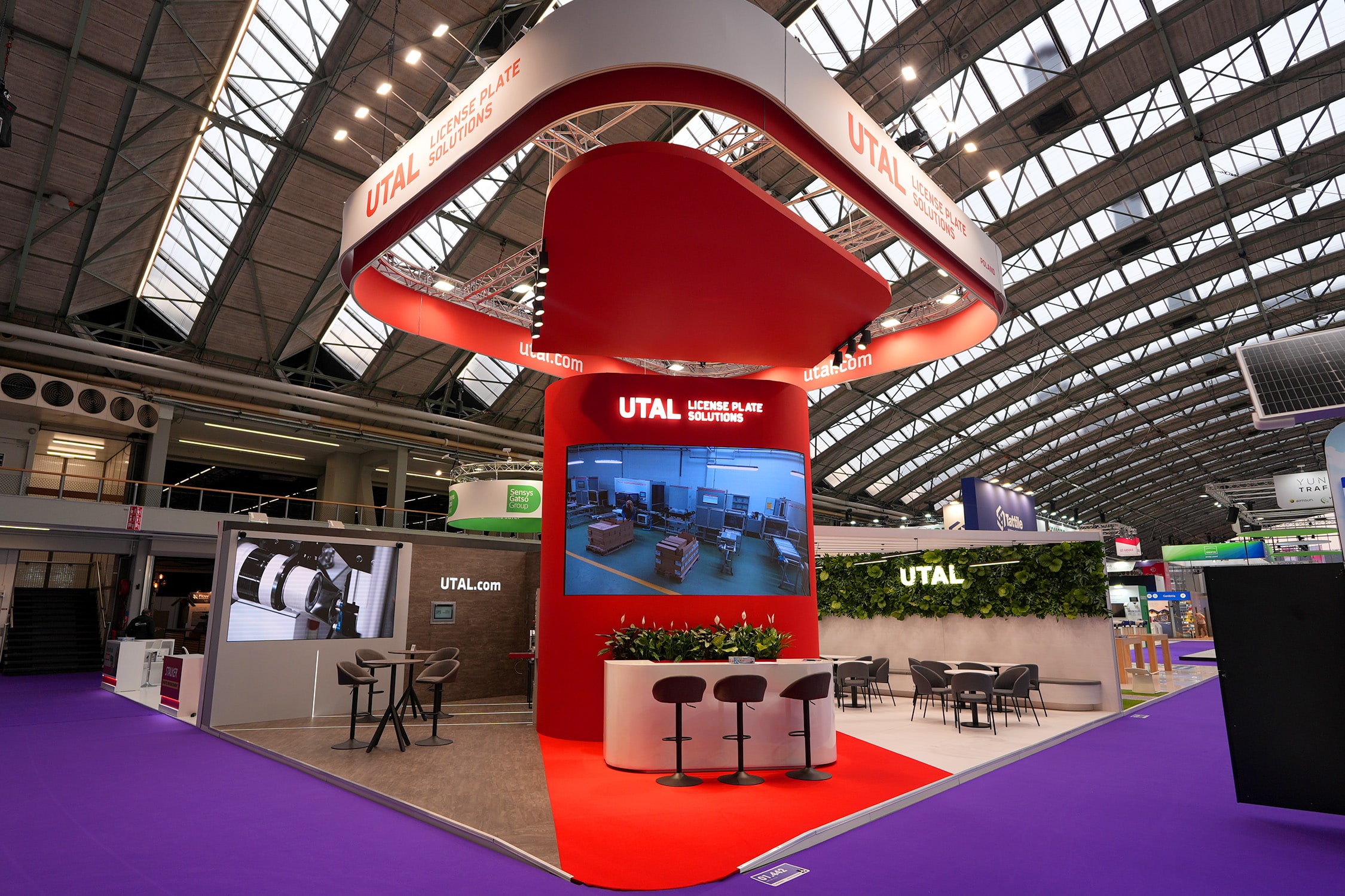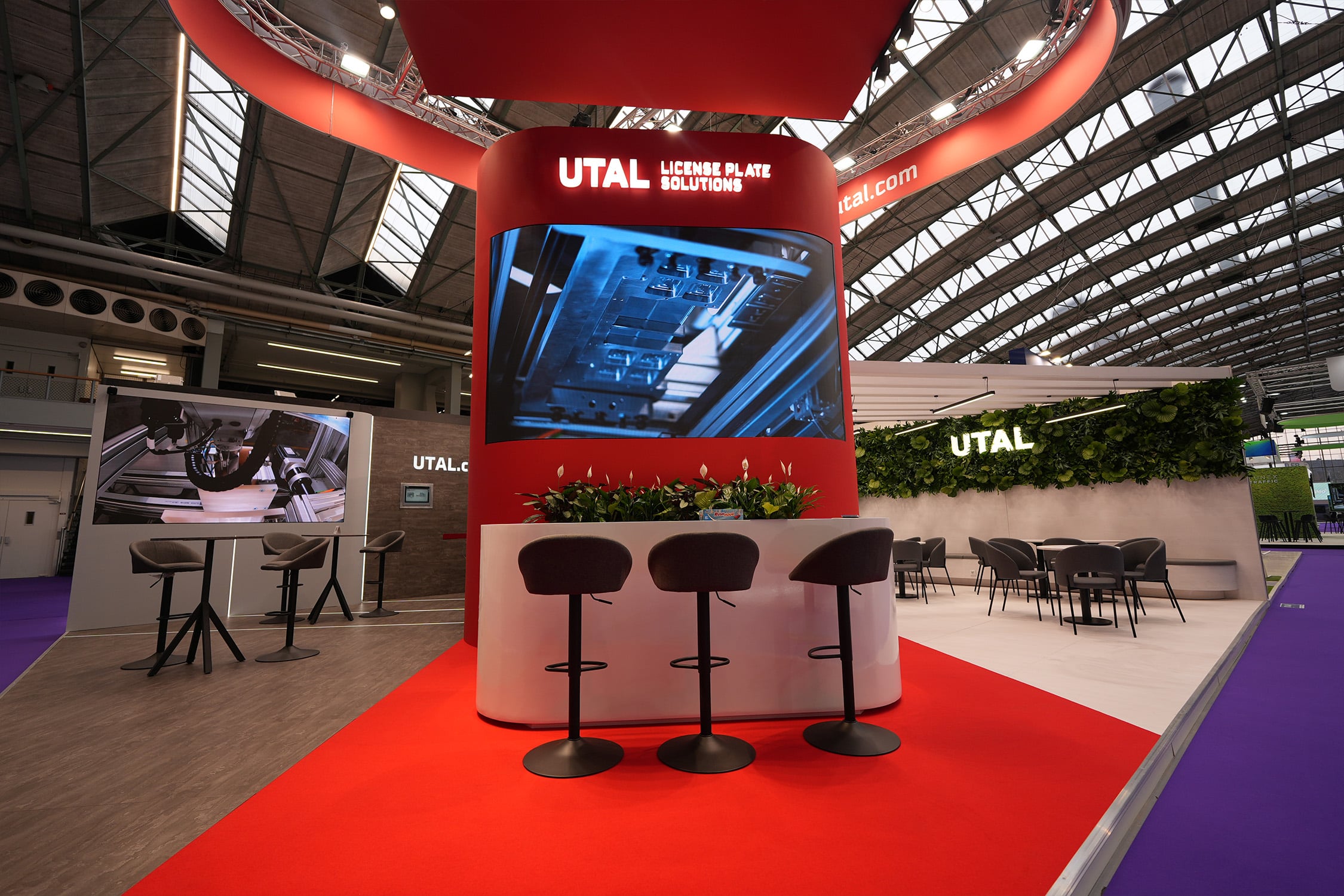 Stoisko targowe dla firmy UTAL License Plate Solutions zaprezentowane podczas targów Intertraffic Amsterdam zostało zaprojektowane na powierzchni 100 m². Wyróżniało się nowoczesną, otwartą architekturą. Centralnym elementem przestrzeni była wysoka, czerwona konstrukcja z dużym ekranem prezentacyjnym, która przyciągała uwagę odwiedzających już z dalszej części hali. Nad stoiskiem zawieszono charakterystyczną konstrukcję sufitową w formie podwieszanej ramy z logotypem firmy, dzięki czemu marka była dobrze widoczna z różnych stron hali.